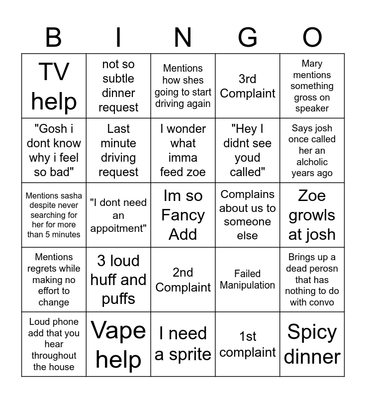 This bingo card has a free space and 24 words: 3 loud huff and puffs, Vape help, I wonder what imma feed zoe, Loud phone add that you hear throughout the house, Mary mentions something gross on speaker, TV help, "Gosh i dont know why i feel so bad", not so subtle dinner request, Complains about us to someone else, 2nd Complaint, "Hey I didnt see youd called", Mentions sasha despite never searching for her for more than 5 minutes, Failed Manipulation, Brings up a dead perosn that has nothing to do with convo, Last minute driving request, 1st complaint, Zoe growls at josh, Mentions how shes going to start driving again, Says josh once called her an alcholic years ago, "I dont need an appoitment", Spicy dinner, Mentions regrets while making no effort to change, 3rd Complaint and I need a sprite.
