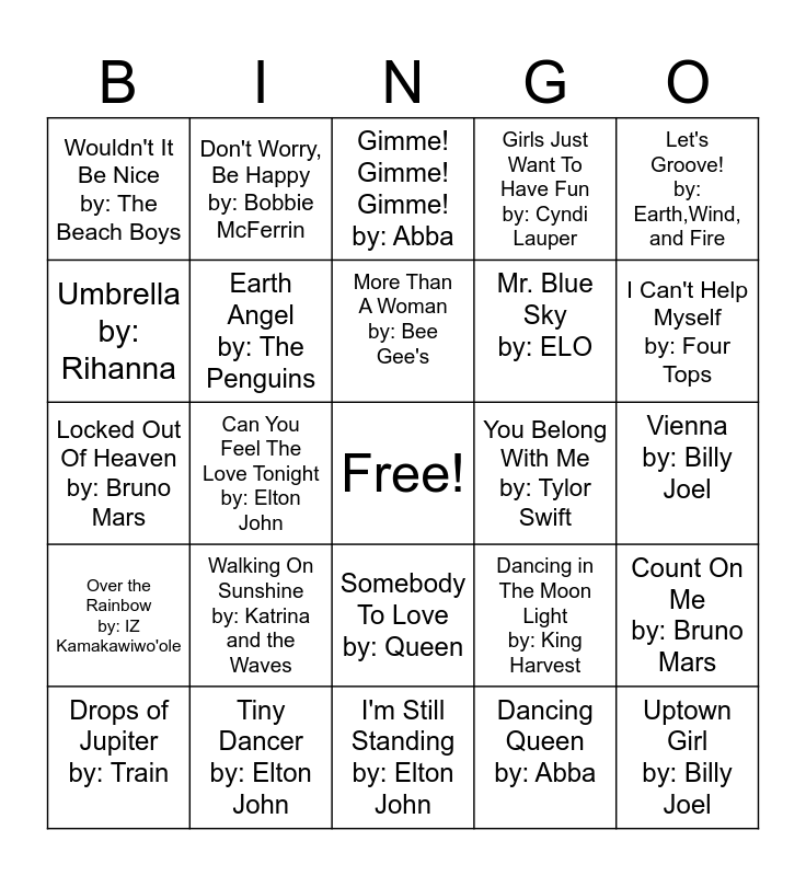 This bingo card has a free space and 24 words: Walking On Sunshine by: Katrina and the Waves, Tiny Dancer by: Elton John, More Than A Woman by: Bee Gee's, Drops of Jupiter by: Train, Let's Groove! by: Earth,Wind, and Fire, Wouldn't It Be Nice by: The Beach Boys, Umbrella by: Rihanna, Don't Worry, Be Happy by: Bobbie McFerrin, You Belong With Me by: Tylor Swift, Somebody To Love by: Queen, Mr. Blue Sky by: ELO, Locked Out Of Heaven by: Bruno Mars, Dancing in The Moon Light by: King Harvest, Count On Me by: Bruno Mars, Earth Angel by: The Penguins, Dancing Queen by: Abba, Vienna by: Billy Joel, Gimme! Gimme! Gimme! by: Abba, I Can't Help Myself by: Four Tops, Can You Feel The Love Tonight by: Elton John, Uptown Girl by: Billy Joel, Over the Rainbow by: IZ Kamakawiwo'ole, Girls Just Want To Have Fun by: Cyndi Lauper and I'm Still Standing by: Elton John.