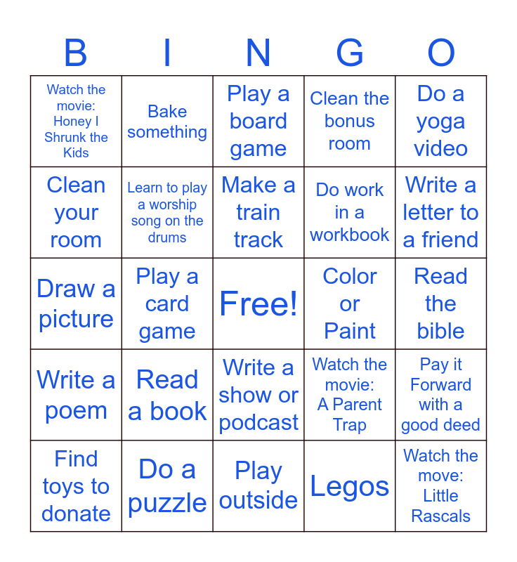 This bingo card has a free space and 24 words: Read a book, Do a puzzle, Make a train track, Find toys to donate, Do a yoga video, Watch the movie: Honey I Shrunk the Kids, Clean your room, Bake something, Color or Paint, Write a show or podcast, Do work in a workbook, Draw a picture, Watch the movie: A Parent Trap, Pay it Forward with a good deed, Learn to play a worship song on the drums, Legos, Read the bible, Play a board game, Write a letter to a friend, Play a card game, Watch the move: Little Rascals, Write a poem, Clean the bonus room and Play outside.