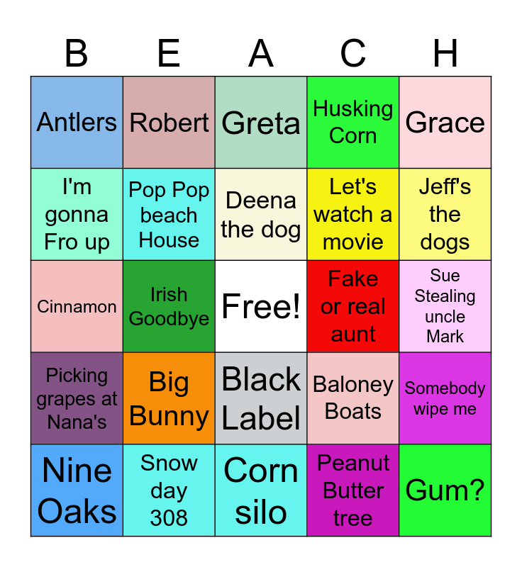 This bingo card has a free space and 47 words: Garth Groman, Gum?, Crazy Keeley family, Corn silo, Big Bunny, My Life, Robert, Aunt Kay, I'm gonna Fro up, Uncle Dave, Pop Pop beach House, Husking Corn, Somebody wipe me, Baloney Boats, Scrapple, Monte Carlo, Deena the dog, Fake or real aunt, Pops farm, Grace, Irish Goodbye, Peanut Butter tree, Antlers, Let's watch a movie, I am a Lutheran, Jeff's the dogs, Nine Oaks, Broken Wrists, Black Label, Picking grapes at Nana's, Alex's candy tie, Manhattan Lodge, AP Cake, Aunt Oley, Tommy, Snow day 308, Sue Stealing uncle Mark, Mamps not letting Kris work with him, Naked Cowboy Wrestler, Camping, Tomato Gravy, Greta, Cinnamon, Uncle Junie, Orphanage, Fifi and Come on Now.