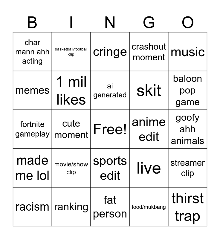 This bingo card has a free space and 24 words: movie/show clip, ranking, ai generated, racism, music, dhar mann ahh acting, memes, basketball/football clip, anime edit, sports edit, skit, fortnite gameplay, live, streamer clip, 1 mil likes, food/mukbang, goofy ahh animals, cringe, baloon pop game, cute moment, thirst trap, made me lol, crashout moment and fat person.