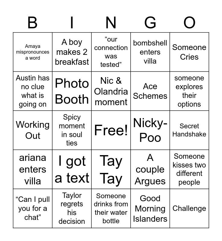 This bingo card has a free space and 24 words: I got a text, Taylor regrets his decision, Nic & Olandria moment, “Can I pull you for a chat”, Someone Cries, Amaya mispronounces a word, Austin has no clue what is going on, A boy makes 2 breakfast, Nicky-Poo, Tay Tay, Ace Schemes, Working Out, A couple Argues, Someone kisses two different people, Photo Booth, Good Morning Islanders, Secret Handshake, ”our connection was tested”, someone explores their options, Spicy moment in soul ties, Challenge, ariana enters villa, bombshell enters villa and Someone drinks from their water bottle.