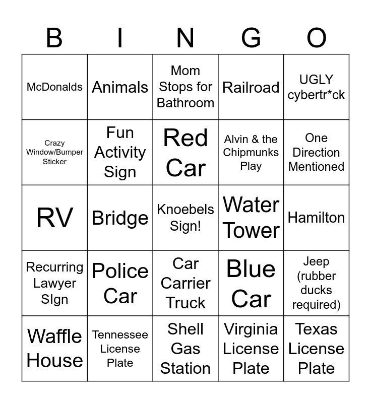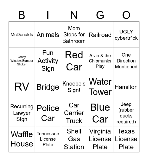 This bingo card has a free space and 24 words: Police Car, Tennessee License Plate, Red Car, Waffle House, UGLY cybertr*ck, McDonalds, Crazy Window/Bumper Sticker, Animals, Water Tower, Car Carrier Truck, Alvin & the Chipmunks Play, RV, Blue Car, Jeep (rubber ducks required), Fun Activity Sign, Virginia License Plate, Hamilton, Mom Stops for Bathroom, One Direction Mentioned, Bridge, Texas License Plate, Recurring Lawyer SIgn, Railroad and Shell Gas Station.