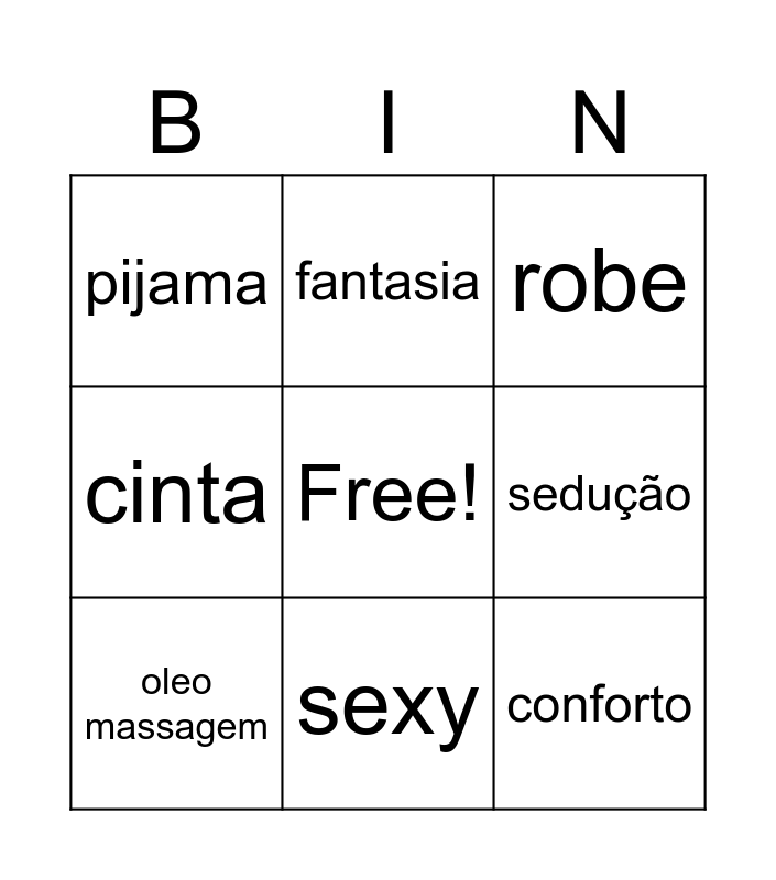 This bingo card has a free space and 24 words: calcinha, sutia, sexy, renda, conforto, pijama, sedução, fantasia, noite, babydoll, presente, amor, lingerie, velas aromaticas, oleo massagem, sutia de renda, camisola, robe, charme, lua de mel, romance, calcinha fio, cinta and cinta liga.