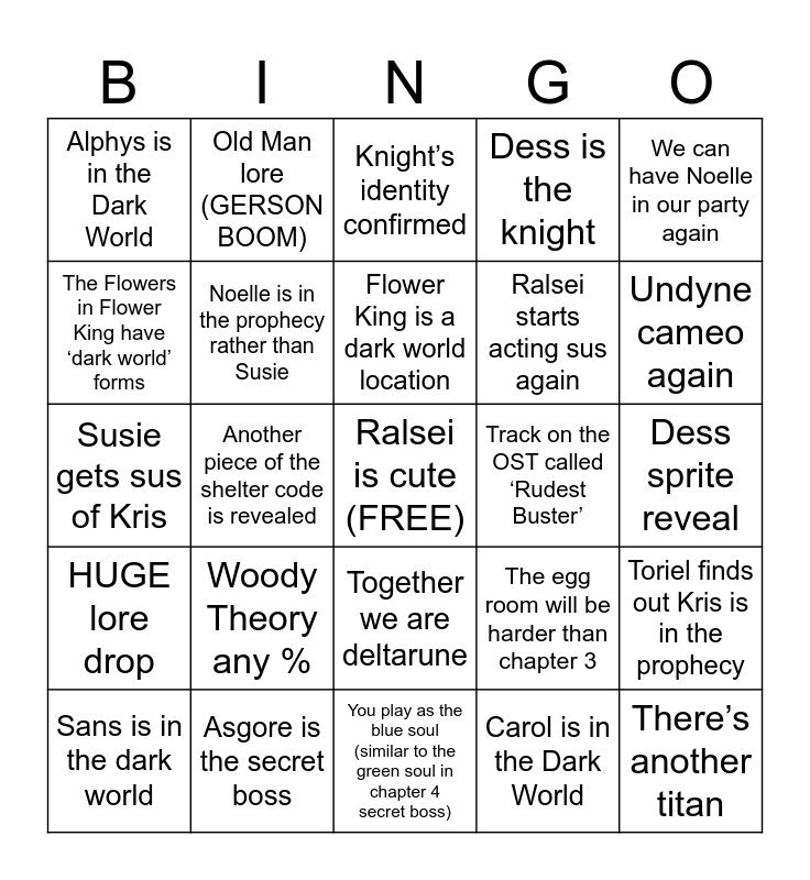 This bingo card has a free space and 24 words: Woody Theory any %, Asgore is the secret boss, Flower King is a dark world location, Sans is in the dark world, We can have Noelle in our party again, Alphys is in the Dark World, The Flowers in Flower King have ‘dark world’ forms, Old Man lore (GERSON BOOM), Track on the OST called ‘Rudest Buster’, Together we are deltarune, Ralsei starts acting sus again, Susie gets sus of Kris, The egg room will be harder than chapter 3, Toriel finds out Kris is in the prophecy, Noelle is in the prophecy rather than Susie, Carol is in the Dark World, Dess sprite reveal, Knight’s identity confirmed, Undyne cameo again, Another piece of the shelter code is revealed, There’s another titan, HUGE lore drop, Dess is the knight and You play as the blue soul (similar to the green soul in chapter 4 secret boss).