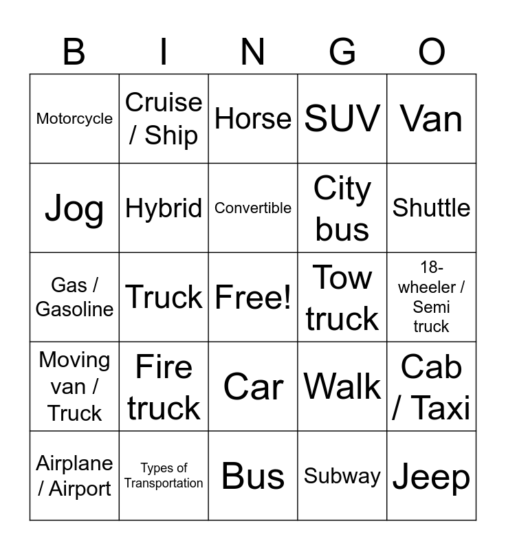 This bingo card has a free space and 41 words: Energy, Gas / Gasoline, Electric, Hybrid, Types of Transportation, Car, Convertible, Limousine, Van, Moving van / Truck, Truck, SUV, Jeep, 18-wheeler / Semi truck, Tow truck, Fire truck, Moped / Scooter, Motorcycle, Bicycle, Horse, Cab / Taxi, School bus, Bus, City bus, Train, Light rail, Subway, Carpool / Carpooling, Shuttle, Boat, Ferry, Cruise / Ship, Airplane / Airport, Helicopter, Walk, Jog, Run / Running, Hitchhike / Hitchhiker, Ride, Rode / Ridden and Experienced.
