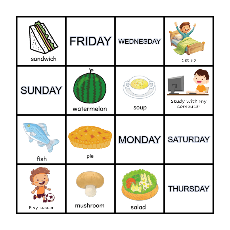 This bingo card has 12 images and 7 words: MONDAY, TUESDAY, WEDNESDAY, THURSDAY, SATURDAY, SUNDAY and FRIDAY.