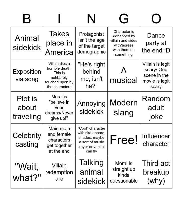 This bingo card has 25 words: Main male and female characters get together at the end, Talking animal sidekick, "He's right behind me, isn't he?", "Wait, what?", Dance party at the end :D, Animal sidekick, Exposition via song, Takes place in America, Modern slang, "Cool" character with skateboard, shades, maybe a sort of music player or vehicle can fly, A musical, Plot is about traveling, Free!, Influencer character, Villain dies a horrible death. This is not/barely touched upon by the characters, Third act breakup (why), Random adult joke, Protagonist isn't the age of the target demographic, Villain is legit scary/ One scene in the movie is legit scary, Moral is "believe in your dreams/Never give up!", Annoying sidekick, Villain redemption arc, Celebrity casting, Character is kidnapped by villain and sides with/agrees with them on something and Moral is straight up kinda questionable.