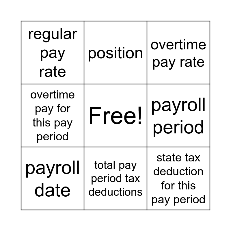 This bingo card has a free space and 22 words: name, personnel no., position, payroll weekly hourly, payroll period, payroll date, regular pay rate, overtime pay rate, number of regular pay hours, number of overtime pay hours, regular pay for this pay period, overtime pay for this pay period, total pay for this pay period, retirement savings deduction for this pay period, health insurance (pre-tax HMO) deduction for this pay period, total tax-exempt deductions for this pay period, federal withholding tax deduction for this pay period, social security tax deduction for this pay period, Medicare tax deduction for this pay period, state tax deduction for this pay period, total pay period tax deductions and take-home pay.