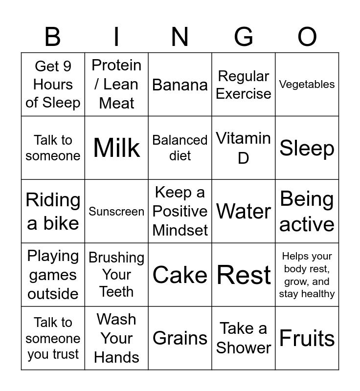 This bingo card has 25 words: Brushing Your Teeth, Grains, Balanced diet, Talk to someone you trust, Vegetables, Get 9 Hours of Sleep, Talk to someone, Protein / Lean Meat, Water, Cake, Vitamin D, Riding a bike, Rest, Helps your body rest, grow, and stay healthy, Milk, Fruits, Being active, Banana, Sleep, Sunscreen, Keep a Positive Mindset, Wash Your Hands, Playing games outside, Regular Exercise and Take a Shower.
