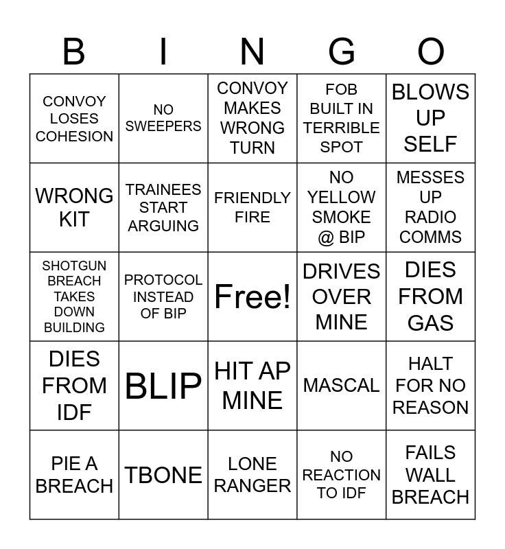 This bingo card has a free space and 24 words: BLIP, TBONE, FRIENDLY FIRE, PIE A BREACH, BLOWS UP SELF, CONVOY LOSES COHESION, WRONG KIT, NO SWEEPERS, DRIVES OVER MINE, HIT AP MINE, NO YELLOW SMOKE @ BIP, SHOTGUN BREACH TAKES DOWN BUILDING, MASCAL, HALT FOR NO REASON, TRAINEES START ARGUING, NO REACTION TO IDF, DIES FROM GAS, CONVOY MAKES WRONG TURN, MESSES UP RADIO COMMS, PROTOCOL INSTEAD OF BIP, FAILS WALL BREACH, DIES FROM IDF, FOB BUILT IN TERRIBLE SPOT and LONE RANGER.