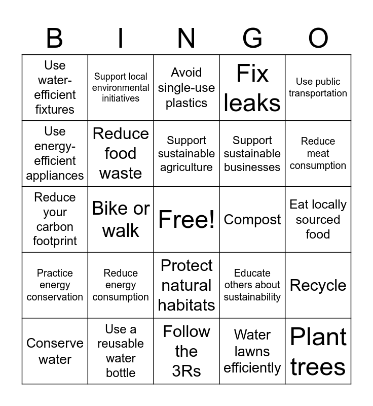 This bingo card has a free space and 24 words: Reduce energy consumption, Use a reusable water bottle, Support sustainable agriculture, Conserve water, Use public transportation, Use water-efficient fixtures, Use energy-efficient appliances, Support local environmental initiatives, Compost, Protect natural habitats, Support sustainable businesses, Reduce your carbon footprint, Educate others about sustainability, Recycle, Reduce food waste, Water lawns efficiently, Eat locally sourced food, Avoid single-use plastics, Reduce meat consumption, Bike or walk, Plant trees, Practice energy conservation, Fix leaks and Follow the 3Rs.