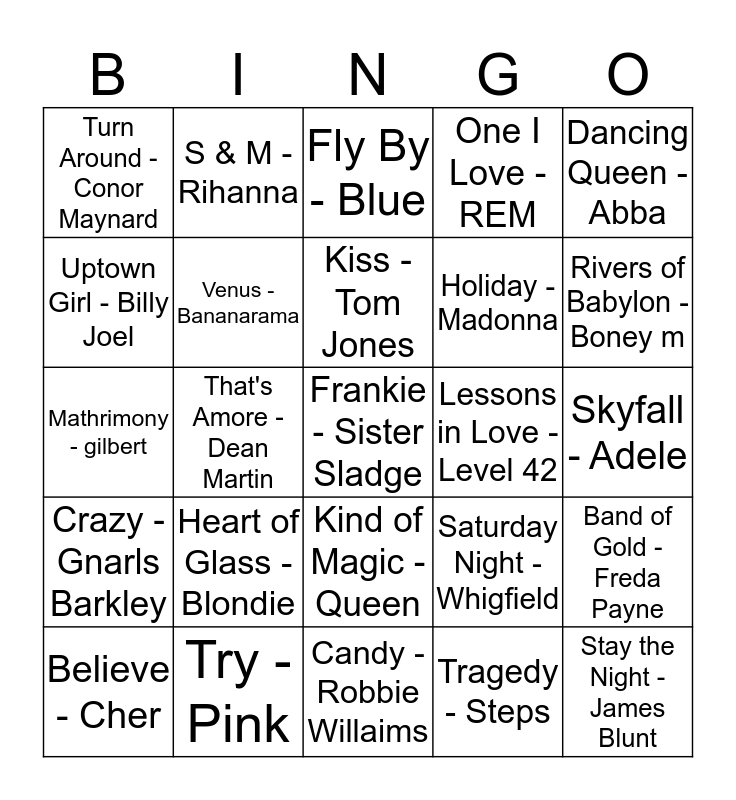 This bingo card has 48 words: FREE!, Frankie - Sister Sladge, True - Spandau ballet, Candy - Robbie Willaims, Heart of Glass - Blondie, Marry You - Bruno Mars, S & M - Rihanna, Poker Face - Lady Gaga, Uptown Girl - Billy Joel, Love me Do - Beatles, Venus - Bananarama, One I Love - REM, Band of Gold - Freda Payne, Saturday Night - Whigfield, Penny Arcade - Roy Orbison, Some Girls - Racey, Kiss - Tom Jones, Lessons in Love - Level 42, Rhythm is a Dancer - Snap, Dancing Queen - Abba, That's Amore - Dean Martin, Tragedy - Steps, Turn Around - Conor Maynard, Holiday - Madonna, Footloose - Kenny Loggins, Rivers of Babylon - Boney m, Believe - Cher, Up the Junction - Squeeze, Kind of Magic - Queen, Crazy - Gnarls Barkley, Maneater - Nelly Furtado, Maggie May - Rod Stewart, Drive By - Train, Next to Me - Emeli Sandi, Try - Pink, Stars - Simply Red, Ho Hey - Lumineers, Skyfall - Adele, Lego House - Ed Sheeran, Paradise - Coldplay, Firework - Katy Perry, Stay the Night - James Blunt, Fly By - Blue, Freedom - Wham, Mathrimony - gilbert, Reach - S Club 7, Magic - Pilot and Kingston Town - UB 40.