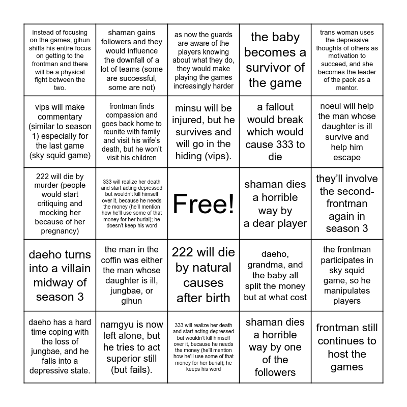 This bingo card has a free space and 24 words: the man in the coffin was either the man whose daughter is ill, jungbae, or gihun, namgyu is now left alone, but he tries to act superior still (but fails)., minsu will be injured, but he survives and will go in the hiding (vips)., daeho has a hard time coping with the loss of jungbae, and he falls into a depressive state., trans woman uses the depressive thoughts of others as motivation to succeed, and she becomes the leader of the pack as a mentor., instead of focusing on the games, gihun shifts his entire focus on getting to the frontman and there will be a physical fight between the two., vips will make commentary (similar to season 1) especially for the last game (sky squid game), shaman gains followers and they would influence the downfall of a lot of teams (some are successful, some are not), shaman dies a horrible way by a dear player, 222 will die by natural causes after birth, a fallout would break which would cause 333 to die, 222 will die by murder (people would start critiquing and mocking her because of her pregnancy), daeho, grandma, and the baby all split the money but at what cost, the frontman participates in sky squid game, so he manipulates players, frontman finds compassion and goes back home to reunite with family and visit his wife’s death, but he won’t visit his children, shaman dies a horrible way by one of the followers, they’ll involve the second-frontman again in season 3, as now the guards are aware of the players knowing about what they do, they would make playing the games increasingly harder, noeul will help the man whose daughter is ill survive and help him escape, 333 will realize her death and start acting depressed but wouldn’t kill himself over it, because he needs the money (he’ll mention how he’ll use some of that money for her burial); he doesn’t keep his word, frontman still continues to host the games, daeho turns into a villain midway of season 3, the baby becomes a survivor of the game and 333 will realize her death and start acting depressed but wouldn’t kill himself over it, because he needs the money (he’ll mention how he’ll use some of that money for her burial); he keeps his word.