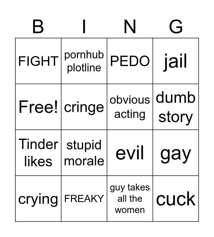 This bingo card has 16 words: FREAKY, gay, PEDO, FIGHT, Tinder likes, pornhub plotline, evil, guy takes all the women, Free!, cringe, crying, jail, stupid morale, dumb story, obvious acting and cuck.