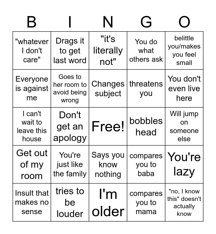 This bingo card has a free space and 24 words: You're just like the family, tries to be louder, Changes subject, Insult that makes no sense, belittle you/makes you feel small, "whatever I don't care", Everyone is against me, Drags it to get last word, bobbles head, Says you know nothing, threatens you, I can't wait to leave this house, compares you to baba, You're lazy, Goes to her room to avoid being wrong, compares you to mama, Will jump on someone else, "it's literally not", You don't even live here, Don't get an apology, "no, I know this" doesn't actually know, Get out of my room, You do what others ask and I'm older.