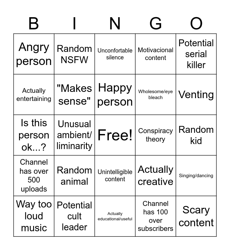 This bingo card has a free space and 24 words: Random animal, Potential cult leader, Happy person, Way too loud music, Potential serial killer, Angry person, Actually entertaining, Random NSFW, Conspiracy theory, Unintelligible content, Wholesome/eye bleach, Is this person ok...?, Actually creative, Singing/dancing, "Makes sense", Channel has 100 over subscribers, Random kid, Unconfortable silence, Venting, Unusual ambient/ liminarity, Scary content, Channel has over 500 uploads, Motivacional content and Actually educational/useful.
