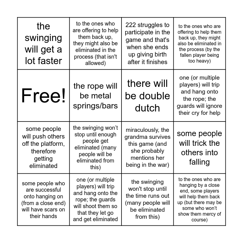 This bingo card has 16 words: one (or multiple players) will trip and hang onto the rope; the guards will shoot them so that they let go and get eliminated, some people will trick the others into falling, 222 struggles to participate in the game and that's when she ends up giving birth after it finishes, the swinging will get a lot faster, some people will push others off the platform, therefore getting eliminated, to the ones who are offering to help them back up, they might also be eliminated in the process (that isn't allowed), miraculously, the grandma survives this game (and she probably mentions her being in the war), the swinging won't stop until the time runs out (many people will be eliminated from this), Free!, the rope will be metal springs/bars, some people who are successful onto hanging on (from a close end) will have scars on their hands, to the ones who are offering to help them back up, they might also be eliminated in the process (by the fallen player being too heavy), the swinging won’t stop until enough people get eliminated (many people will be eliminated from this), one (or multiple players) will trip and hang onto the rope; the guards will ignore their cry for help, there will be double dutch and to the ones who are hanging by a close end, some players will help them back up (but there may be some who won’t show them mercy of course).