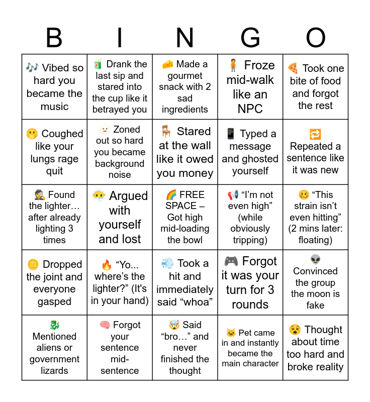 This bingo card has a free space and 24 words: 🔥 “Yo... where’s the lighter?” (It's in your hand), 🧠 Forgot your sentence mid-sentence, 🪑 Stared at the wall like it owed you money, 🐉 Mentioned aliens or government lizards, 🍕 Took one bite of food and forgot the rest, 🎶 Vibed so hard you became the music, 🫢 Coughed like your lungs rage quit, 🧃 Drank the last sip and stared into the cup like it betrayed you, 📢 “I’m not even high” (while obviously tripping), 💨 Took a hit and immediately said “whoa”, 📱 Typed a message and ghosted yourself, 🕵️ Found the lighter… after already lighting 3 times, 🎮 Forgot it was your turn for 3 rounds, 👽 Convinced the group the moon is fake, 🫥 Zoned out so hard you became background noise, 🐱 Pet came in and instantly became the main character, 🥴 “This strain isn’t even hitting” (2 mins later: floating), 🧀 Made a gourmet snack with 2 sad ingredients, 🔁 Repeated a sentence like it was new, 😶🌫️ Argued with yourself and lost, 😵 Thought about time too hard and broke reality, 🪙 Dropped the joint and everyone gasped, 🧍 Froze mid-walk like an NPC and 🤯 Said “bro…” and never finished the thought.