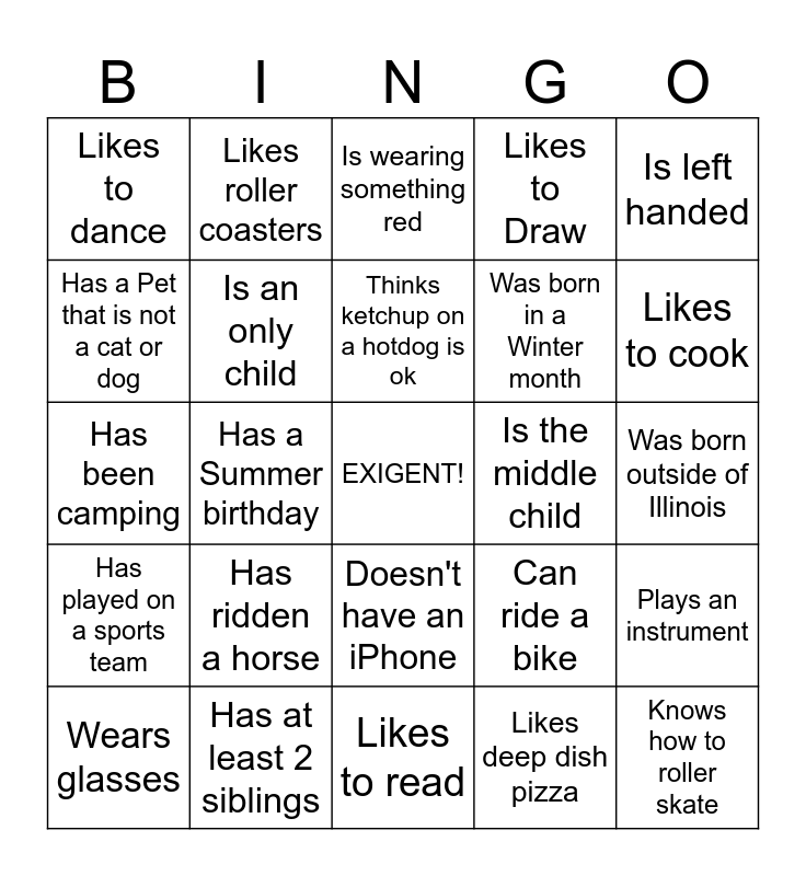 This bingo card has a free space and 24 words: Has ridden a horse, Has at least 2 siblings, Thinks ketchup on a hotdog is ok, Wears glasses, Is left handed, Likes to dance, Has a Pet that is not a cat or dog, Likes roller coasters, Is the middle child, Doesn't have an iPhone, Was born in a Winter month, Has been camping, Can ride a bike, Plays an instrument, Is an only child, Likes deep dish pizza, Was born outside of Illinois, Is wearing something red, Likes to cook, Has a Summer birthday, Knows how to roller skate, Has played on a sports team, Likes to Draw and Likes to read.