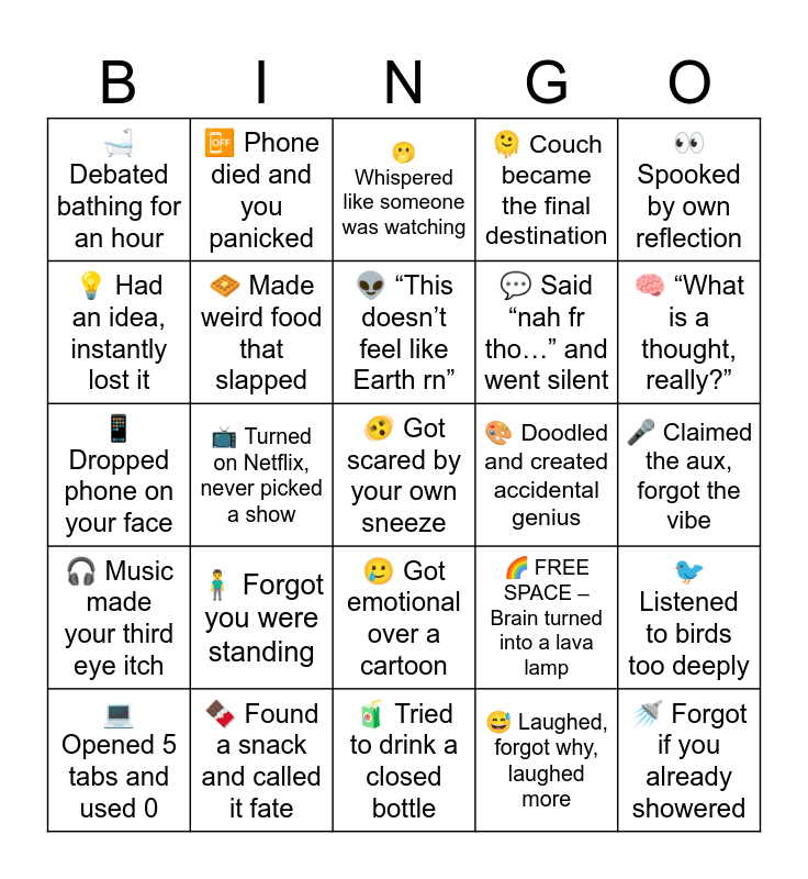 This bingo card has 25 words: π§ββοΈ Forgot you were standing, π§ Tried to drink a closed bottle, π½ βThis doesnβt feel like Earth rnβ, π» Opened 5 tabs and used 0, π Spooked by own reflection, π Debated bathing for an hour, π‘ Had an idea, instantly lost it, π΄ Phone died and you panicked, π¨ Doodled and created accidental genius, π₯² Got emotional over a cartoon, π¬ Said βnah fr thoβ¦β and went silent, π± Dropped phone on your face, π FREE SPACE β Brain turned into a lava lamp, π¦ Listened to birds too deeply, π§ Made weird food that slapped, πΏ Forgot if you already showered, π€ Claimed the aux, forgot the vibe, π«’ Whispered like someone was watching, π§ βWhat is a thought, really?β, πΊ Turned on Netflix, never picked a show, 𫨠Got scared by your own sneeze, π« Found a snack and called it fate, π§ Music made your third eye itch, π« Couch became the final destination and π Laughed, forgot why, laughed more.