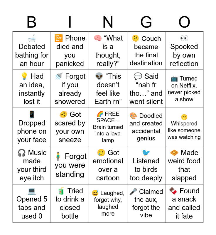 This bingo card has a free space and 24 words: π§ββοΈ Forgot you were standing, π§ Tried to drink a closed bottle, π½ βThis doesnβt feel like Earth rnβ, π» Opened 5 tabs and used 0, π Spooked by own reflection, π Debated bathing for an hour, π‘ Had an idea, instantly lost it, π΄ Phone died and you panicked, π¨ Doodled and created accidental genius, π₯² Got emotional over a cartoon, π¬ Said βnah fr thoβ¦β and went silent, π± Dropped phone on your face, π¦ Listened to birds too deeply, π§ Made weird food that slapped, πΏ Forgot if you already showered, π€ Claimed the aux, forgot the vibe, π«’ Whispered like someone was watching, π§ βWhat is a thought, really?β, πΊ Turned on Netflix, never picked a show, 𫨠Got scared by your own sneeze, π« Found a snack and called it fate, π§ Music made your third eye itch, π« Couch became the final destination and π Laughed, forgot why, laughed more.