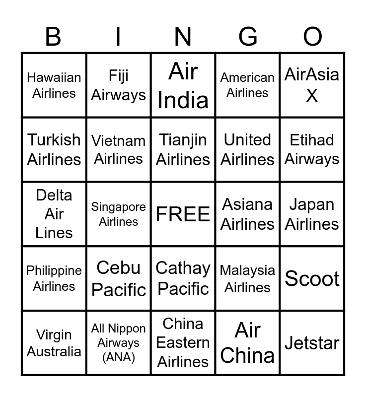This bingo card has a free space and 43 words: QANTAS, Jetstar, REX, Virgin Australia, Air Canada, Air China, Air India, Air New Zealand, AirAsia X, All Nippon Airways (ANA), American Airlines, Asiana Airlines, Cathay Pacific, Cebu Pacific, China Airlines, China Eastern Airlines, China Southern Airlines, Delta Air Lines, Emirates, Etihad Airways, Fiji Airways, Garuda Indonesia, Hainan Airlines, Hawaiian Airlines, Hong Kong Airlines, Japan Airlines, Korean Air, LATAM Airlines, Malaysia Airlines, Philippine Airlines, Qatar Airways, Scoot, Sichuan Airlines, Singapore Airlines, SriLankan Airlines, T'Way Air, Thai Airways International, Tianjin Airlines, Turkish Airlines, United Airlines, VietJet Air, Vietnam Airlines and Xiamen Airlines.