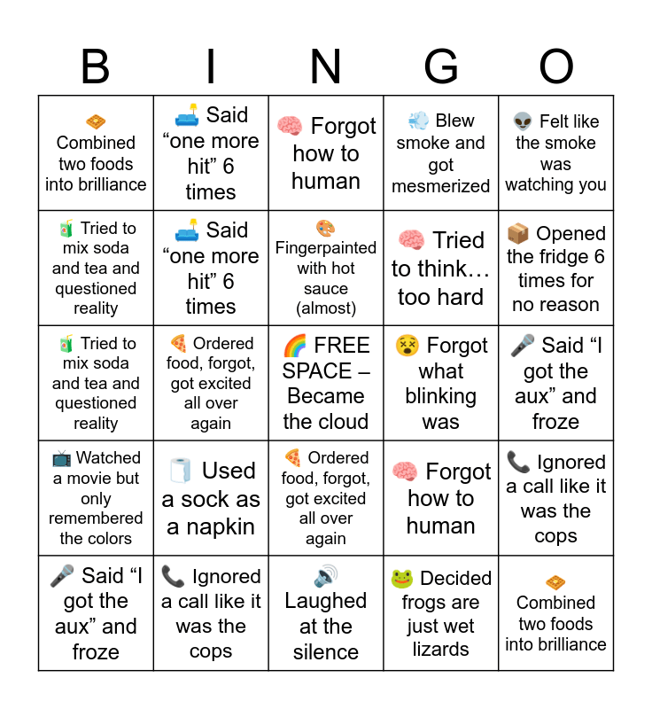 This bingo card has a free space and 45 words: π€£ Laughed so hard you wheezed, π§ Combined two foods into brilliance, πΏ Thought about showering, never did, π€ Said βI got the auxβ and froze, π«’ Whispered even though you were alone, πΈ Decided frogs are just wet lizards, π§ Forgot how to human, πΊ Watched a movie but only remembered the colors, π½ Felt like the smoke was watching you, π Ignored a call like it was the cops, π¨ Blew smoke and got mesmerized, π΅ Forgot what blinking was, π Ordered food, forgot, got excited all over again, π§» Used a sock as a napkin, π«₯ Sat there smiling at nothing, π Laughed at the silence, π¨ Fingerpainted with hot sauce (almost), π§ Tried to mix soda and tea and questioned reality, π§ Tried to thinkβ¦ too hard, π¦ Opened the fridge 6 times for no reason, ποΈ Said βone more hitβ 6 times, πΆ Said βthis song hitsβ to every song, π€£ Laughed so hard you wheezed, π§ Combined two foods into brilliance, πΏ Thought about showering, never did, π€ Said βI got the auxβ and froze, π«’ Whispered even though you were alone, πΈ Decided frogs are just wet lizards, π§ Forgot how to human, πΊ Watched a movie but only remembered the colors, π½ Felt like the smoke was watching you, π Ignored a call like it was the cops, π¨ Blew smoke and got mesmerized, π΅ Forgot what blinking was, π FREE SPACE β Became the cloud, π Ordered food, forgot, got excited all over again, π§» Used a sock as a napkin, π«₯ Sat there smiling at nothing, π Laughed at the silence, π¨ Fingerpainted with hot sauce (almost), π§ Tried to mix soda and tea and questioned reality, π§ Tried to thinkβ¦ too hard, π¦ Opened the fridge 6 times for no reason, ποΈ Said βone more hitβ 6 times and πΆ Said βthis song hitsβ to every song.