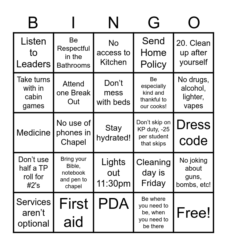 This bingo card has 31 words: PDA, Girls vs Guys sides, No use of phones in Chapel, Rule of 3, Listen to Leaders, No access to Kitchen, Attend one Break Out, Cleaning day is Friday, Don’t skip on KP duty, -25 per student that skips, Be where you need to be, when you need to be there, Dress code, Stay hydrated!, Free!, No fireworks including poppers, No drugs, alcohol, lighter, vapes, Bag checks, No joking about guns, bombs, etc!, Bring your Bible, notebook and pen to chapel, Don’t use half a TP roll for #2's, Lights out 11:30pm, 20. Clean up after yourself, No rough housing, Services aren’t optional, Be Respectful in the Bathrooms, Be especially kind and thankful to our cooks!, Take turns with in cabin games, Send Home Policy, Medicine, First aid, Don’t mess with beds and Don’t break stuff.