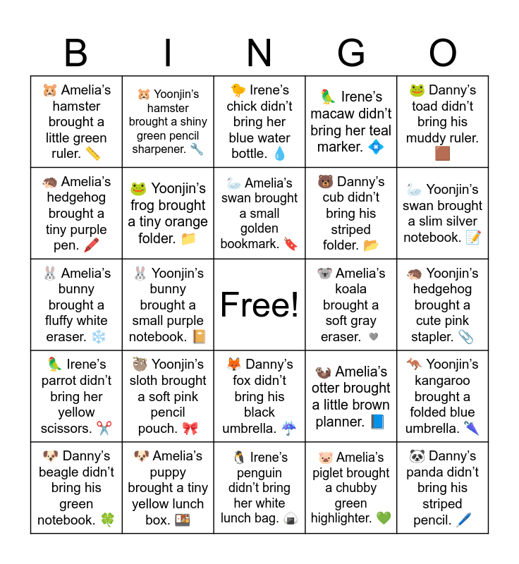 This bingo card has a free space and 30 words: 🐶 Amelia’s puppy brought a tiny yellow lunch box. 🍱, 🐱 Irene’s kitten didn’t bring her pink pencil case. ✏️, 🐰 Yoonjin’s bunny brought a small purple notebook. 📔, 🐻 Danny’s bear didn’t bring his red backpack. 🎒, 🐹 Amelia’s hamster brought a little green ruler. 📏, 🐤 Irene’s chick didn’t bring her blue water bottle. 💧, 🐸 Yoonjin’s frog brought a tiny orange folder. 📁, 🦊 Danny’s fox didn’t bring his black umbrella. ☔, 🐨 Amelia’s koala brought a soft gray eraser. 🩶, 🐧 Irene’s penguin didn’t bring her white lunch bag. 🍙, 🦔 Yoonjin’s hedgehog brought a cute pink stapler. 📎, 🐼 Danny’s panda didn’t bring his striped pencil. 🖊️, 🐷 Amelia’s piglet brought a chubby green highlighter. 💚, 🦉 Irene’s owl didn’t bring her sparkly blue pen. 💙, 🦢 Yoonjin’s swan brought a slim silver notebook. 📝, 🦁 Danny’s lion didn’t bring his orange glue stick. 🟧, 🦦 Amelia’s otter brought a little brown planner. 📘, 🦜 Irene’s parrot didn’t bring her yellow scissors. ✂️, 🦥 Yoonjin’s sloth brought a soft pink pencil pouch. 🎀, 🐸 Danny’s toad didn’t bring his muddy ruler. 🟫, 🐰 Amelia’s bunny brought a fluffy white eraser. ❄️, 🐱 Irene’s cat didn’t bring her red lunch box. 🍓, 🐹 Yoonjin’s hamster brought a shiny green pencil sharpener. 🔧, 🐻 Danny’s cub didn’t bring his striped folder. 📂, 🦔 Amelia’s hedgehog brought a tiny purple pen. 🖍️, 🦜 Irene’s macaw didn’t bring her teal marker. 💠, 🦘 Yoonjin’s kangaroo brought a folded blue umbrella. 🌂, 🐶 Danny’s beagle didn’t bring his green notebook. 🍀, 🦢 Amelia’s swan brought a small golden bookmark. 🔖 and 🦊 Irene’s fox didn’t bring her polka-dot pencil case. 🎨.