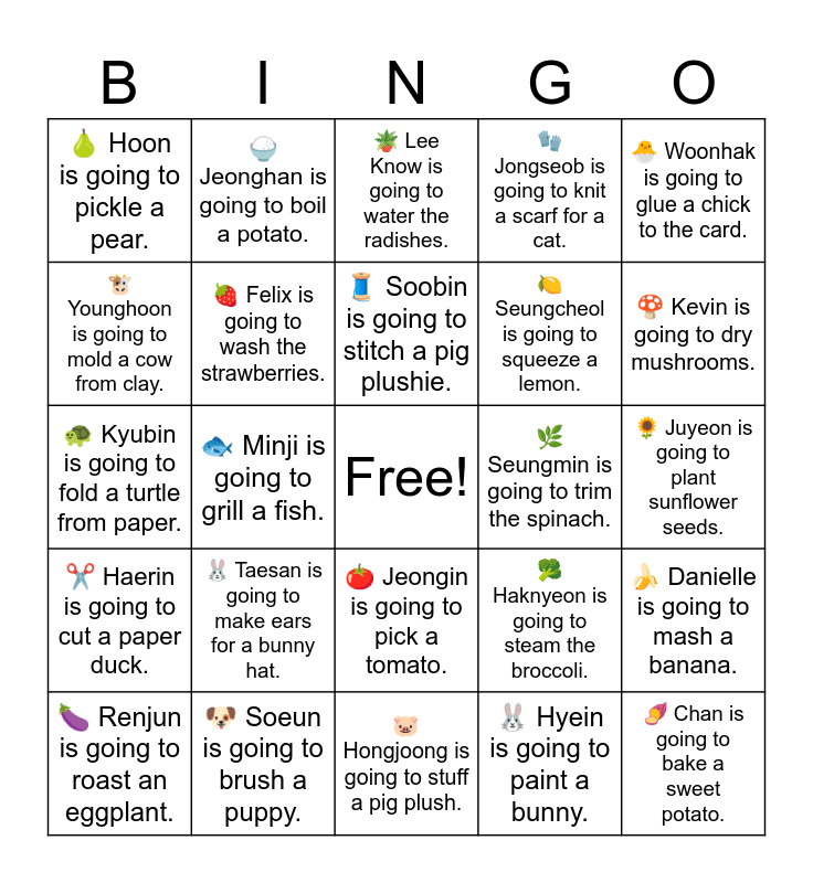 This bingo card has a free space and 32 words: ๐ฐ Hyein is going to paint a bunny., ๐ฅ Hyunjin is going to peel a carrot., ๐ Minji is going to grill a fish., ๐ฑ Sungho is going to plant some lettuce., โ๏ธ Haerin is going to cut a paper duck., ๐ Felix is going to wash the strawberries., ๐ฃ Woonhak is going to glue a chick to the card., ๐ Danielle is going to mash a banana., ๐ Jeonghan is going to boil a potato., ๐ฝ Hanni is going to roast corn., ๐งต Soobin is going to stitch a pig plushie., ๐ชด Lee Know is going to water the radishes., ๐ Haechan is going to slice an apple., ๐ธ Taemin is going to draw a frog., ๐ฟ Seungmin is going to trim the spinach., ๐ฅ Riwoo is going to tape feathers on a bird craft., ๐ Renjun is going to roast an eggplant., ๐ข Kyubin is going to fold a turtle from paper., ๐ Jeongin is going to pick a tomato., ๐ฐ Taesan is going to make ears for a bunny hat., ๐ฅฆ Haknyeon is going to steam the broccoli., ๐ Eunchae is going to decorate a peach., ๐ป Juyeon is going to plant sunflower seeds., ๐ถ Soeun is going to brush a puppy., ๐ Chan is going to bake a sweet potato., ๐งค Jongseob is going to knit a scarf for a cat., ๐ Seungcheol is going to squeeze a lemon., ๐ฎ Younghoon is going to mold a cow from clay., ๐ Hoon is going to pickle a pear., ๐ท Hongjoong is going to stuff a pig plush., ๐ง Jiung is going to juice an orange. and ๐ Kevin is going to dry mushrooms..