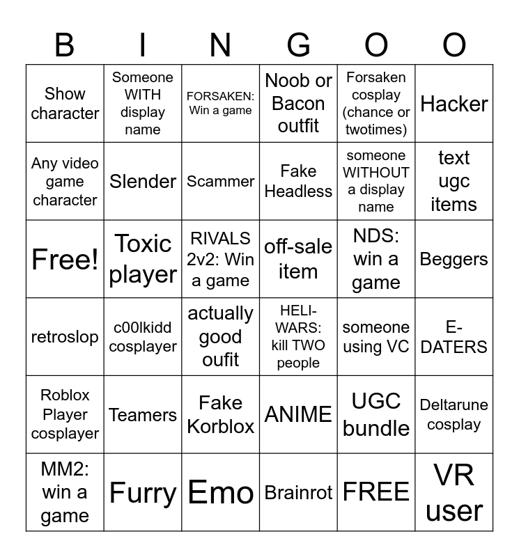 This bingo card has 36 words: ANIME, Fake Korblox, Brainrot, Any video game character, retroslop, off-sale item, Slender, Emo, Forsaken cosplay (chance or twotimes), UGC bundle, text ugc items, Noob or Bacon outfit, Deltarune cosplay, Toxic player, Fake Headless, Show character, Roblox Player cosplayer, NDS: win a game, Free!, FORSAKEN: Win a game, RIVALS 2v2: Win a game, c00lkidd cosplayer, HELI-WARS: kill TWO people, actually good oufit, someone using VC, Someone WITH display name, someone WITHOUT a display name, Furry, Scammer, Hacker, VR user, MM2: win a game, E-DATERS, Beggers, Teamers and FREE.