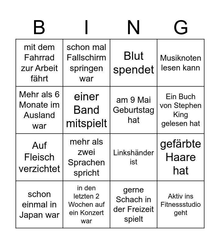 This bingo card has 16 words: in den letzten 2 Wochen auf ein Konzert war, gefärbte Haare hat, Blut spendet, mit dem Fahrrad zur Arbeit fährt, Auf Fleisch verzichtet, schon mal Fallschirm springen war, Linkshänder ist, gerne Schach in der Freizeit spielt, Mehr als 6 Monate im Ausland war, einer Band mitspielt, schon einmal in Japan war, Musiknoten lesen kann, mehr als zwei Sprachen spricht, Ein Buch von Stephen King gelesen hat, am 9 Mai Geburtstag hat and Aktiv ins Fitnessstudio geht.