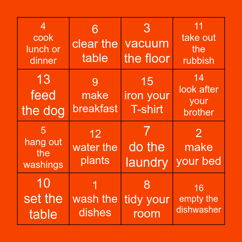 This bingo card has 16 words: 1 wash the dishes, 2 make your bed, 3 vacuum the floor, 4 cook lunch or dinner, 5 hang out the washings, 6 clear the table, 7 do the laundry, 8 tidy your room, 13 feed the dog, 9 make breakfast, 10 set the table, 11 take out the rubbish, 12 water the plants, 14 look after your brother, 15 iron your T-shirt and 16 empty the dishwasher.