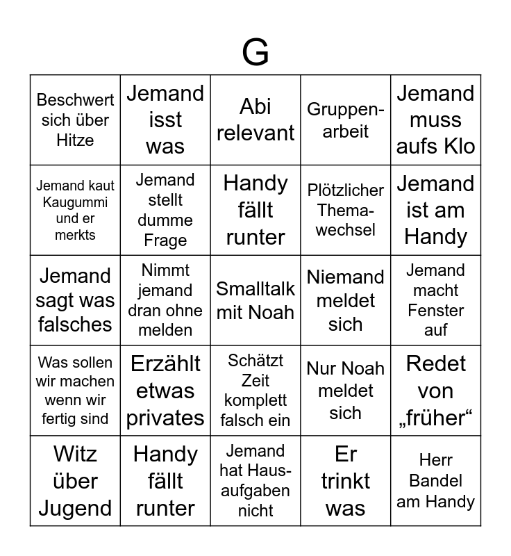 This bingo card has a free space and 31 words: Jemand hat Haus-aufgaben nicht, Wiederholt sich mehr als zwei mal, Nimmt jemand dran ohne melden, „Ist ja kein Sternchenthema“, Beschwert sich über Hitze, Abi relevant, Jemand stellt dumme Frage, Nur Noah meldet sich, Niemand meldet sich, Er trinkt was, Jemand macht Fenster auf, Herr Bandel am Handy, Erzählt von seinem Garten, Zeigt was mit seinem Bambusstab, Jemand ist am Handy, Ändert irgendwas am Klassen-zimmer, Redet von „früher“, Erzählt etwas privates, Was sollen wir machen wenn wir fertig sind, Schätzt Zeit komplett falsch ein, Jemand muss aufs Klo, Noah muss aufs Klo, Witz über Jugend, Jemand isst was, Plötzlicher Thema-wechsel, Jemand kaut Kaugummi und er merkts, Gruppen-arbeit, Jemand sagt was falsches, Handy fällt runter, Handy fällt runter and Macht früher Schluss.