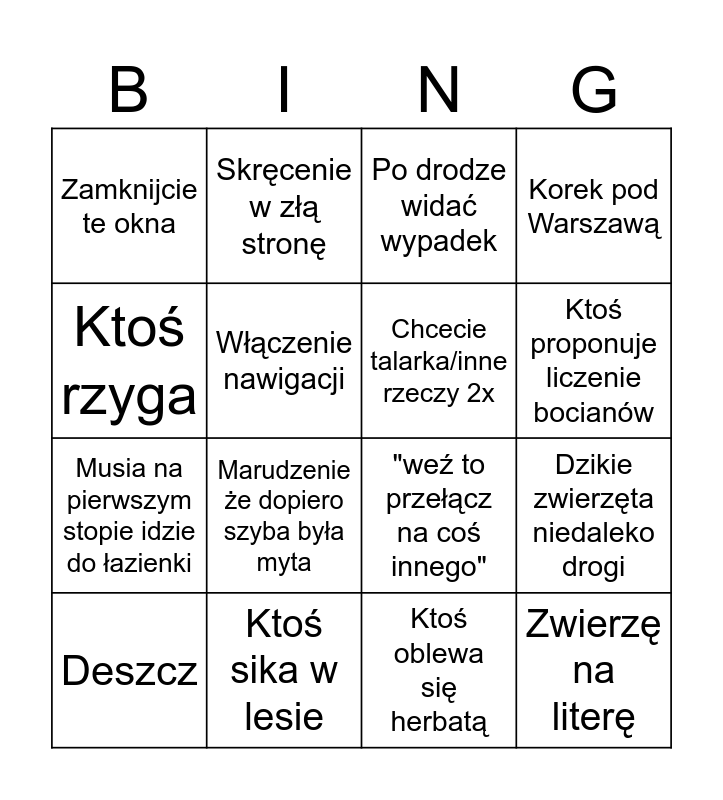 This bingo card has 16 words: Ktoś sika w lesie, Dzikie zwierzęta niedaleko drogi, Po drodze widać wypadek, Zamknijcie te okna, Musia na pierwszym stopie idzie do łazienki, Skręcenie w złą stronę, "weź to przełącz na coś innego", Ktoś oblewa się herbatą, Ktoś rzyga, Włączenie nawigacji, Deszcz, Korek pod Warszawą, Marudzenie że dopiero szyba była myta, Ktoś proponuje liczenie bocianów, Chcecie talarka/inne rzeczy 2x and Zwierzę na literę.
