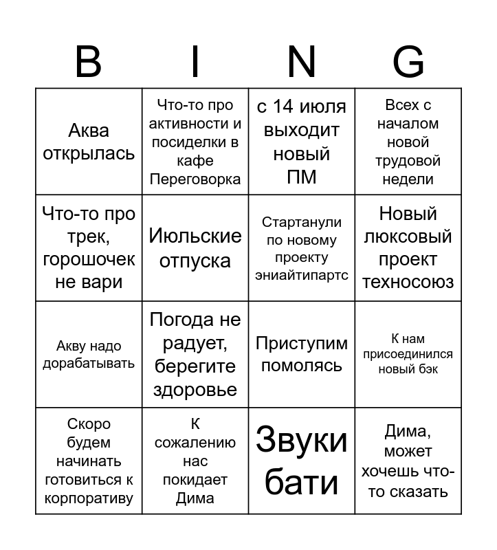 This bingo card has 16 words: К сожалению нас покидает Дима, К нам присоединился новый бэк, с 14 июля выходит новый ПМ, Аква открылась, Акву надо дорабатывать, Что-то про активности и посиделки в кафе Переговорка, Приступим помолясь, Звуки бати, Что-то про трек, горошочек не вари, Июльские отпуска, Скоро будем начинать готовиться к корпоративу, Всех с началом новой трудовой недели, Погода не радует, берегите здоровье, Новый люксовый проект техносоюз, Стартанули по новому проекту эниайтипартс and Дима, может хочешь что-то сказать.