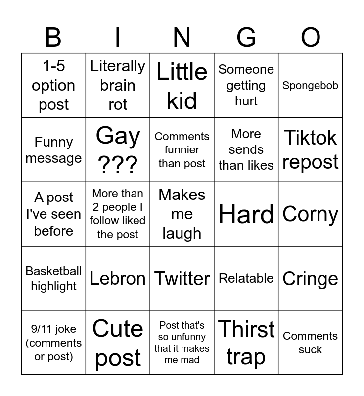 This bingo card has a free space and 24 words: Lebron, Cute post, Comments funnier than post, 9/11 joke (comments or post), Spongebob, 1-5 option post, Funny message, Literally brain rot, Hard, Twitter, More sends than likes, A post I've seen before, Relatable, Cringe, Gay ???, Thirst trap, Corny, Little kid, Tiktok repost, More than 2 people I follow liked the post, Comments suck, Basketball highlight, Someone getting hurt and Post that's so unfunny that it makes me mad.