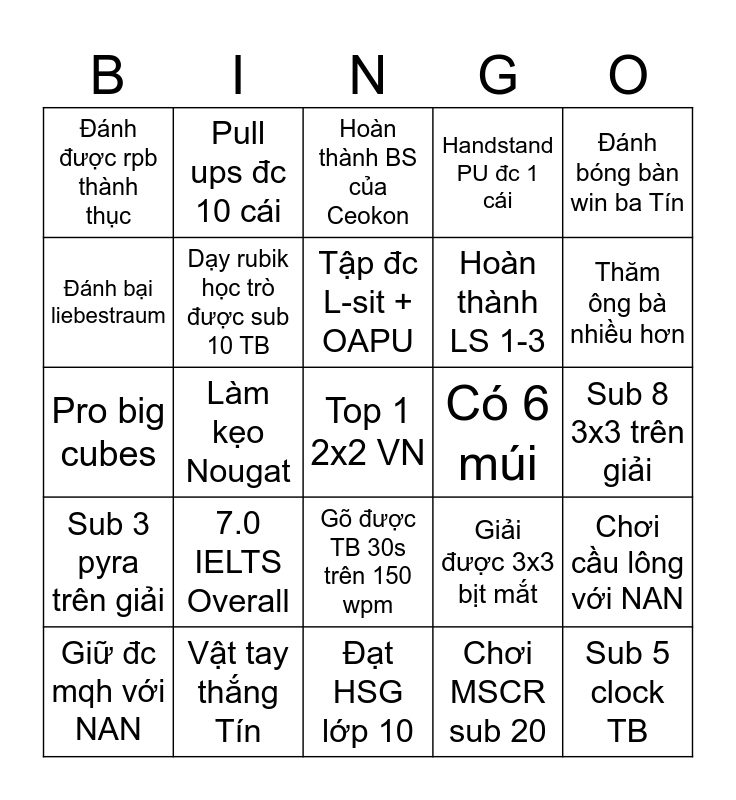 This bingo card has a free space and 24 words: 7.0 IELTS Overall, Vật tay thắng Tín, Tập đc L-sit + OAPU, Giữ đc mqh với NAN, Đánh bóng bàn win ba Tín, Đánh được rpb thành thục, Đánh bại liebestraum, Pull ups đc 10 cái, Có 6 múi, Gõ được TB 30s trên 150 wpm, Hoàn thành LS 1-3, Pro big cubes, Giải được 3x3 bịt mắt, Chơi cầu lông với NAN, Dạy rubik học trò được sub 10 TB, Chơi MSCR sub 20, Sub 8 3x3 trên giải, Hoàn thành BS của Ceokon, Thăm ông bà nhiều hơn, Làm kẹo Nougat, Sub 5 clock TB, Sub 3 pyra trên giải, Handstand PU đc 1 cái and Đạt HSG lớp 10.