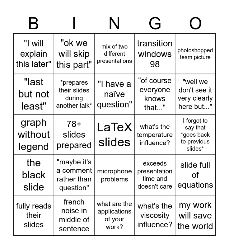 This bingo card has a free space and 24 words: "maybe it's a comment rather than question", french noise in middle of sentence, "I have a naïve question", fully reads their slides, photoshopped team picture, "I will explain this later", "last but not least", "ok we will skip this part", what's the temperature influence?, microphone problems, "of course everyone knows that...", graph without legend, exceeds presentation time and doesn't care, slide full of equations, *prepares their slides during another talk*, what's the viscosity influence?, I forgot to say that *goes back to previous slides*, mix of two different presentations, "well we don't see it very clearly here but...", 78+ slides prepared, my work will save the world, the black slide, transition windows 98 and what are the applications of your work?.
