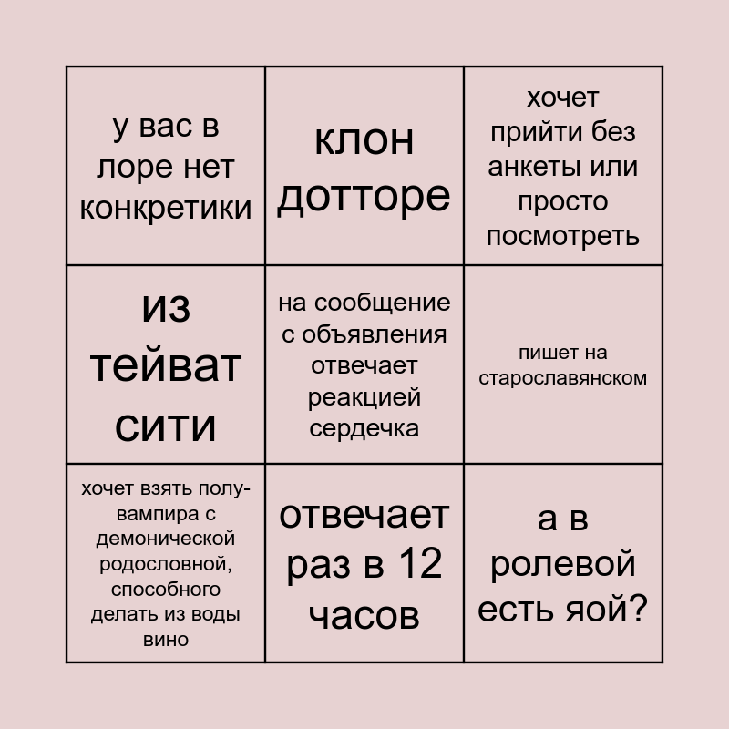 This bingo card has a free space and 8 words: пишет на старославянском, хочет прийти без анкеты или просто посмотреть, клон дотторе, хочет взять полу-вампира с демонической родословной, способного делать из воды вино, у вас в лоре нет конкретики, а в ролевой есть яой?, из тейват сити and отвечает раз в 12 часов.