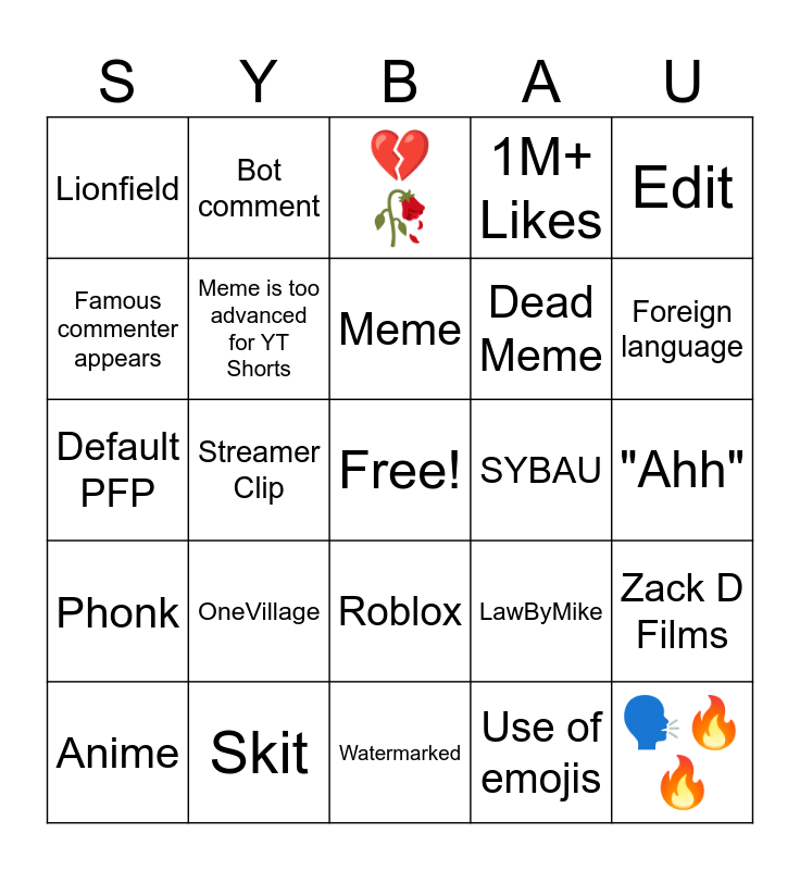 This bingo card has a free space and 24 words: OneVillage, Skit, Meme, Anime, Edit, Lionfield, Famous commenter appears, Bot comment, SYBAU, Roblox, Dead Meme, Default PFP, LawByMike, Zack D Films, Meme is too advanced for YT Shorts, Use of emojis, "Ahh", 💔🥀, Foreign language, Streamer Clip, 🗣️🔥🔥, Phonk, 1M+ Likes and Watermarked.