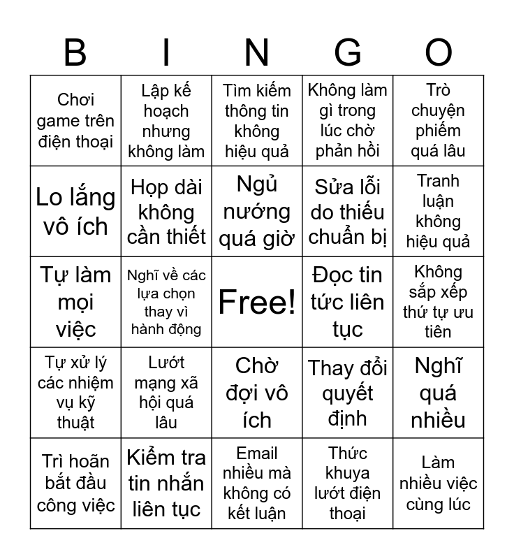 This bingo card has a free space and 24 words: Lướt mạng xã hội quá lâu, Kiểm tra tin nhắn liên tục, Ngủ nướng quá giờ, Trì hoãn bắt đầu công việc, Trò chuyện phiếm quá lâu, Chơi game trên điện thoại, Lo lắng vô ích, Lập kế hoạch nhưng không làm, Đọc tin tức liên tục, Chờ đợi vô ích, Sửa lỗi do thiếu chuẩn bị, Tự làm mọi việc, Thay đổi quyết định, Nghĩ quá nhiều, Họp dài không cần thiết, Thức khuya lướt điện thoại, Không sắp xếp thứ tự ưu tiên, Tìm kiếm thông tin không hiệu quả, Tranh luận không hiệu quả, Nghĩ về các lựa chọn thay vì hành động, Làm nhiều việc cùng lúc, Tự xử lý các nhiệm vụ kỹ thuật, Không làm gì trong lúc chờ phản hồi and Email nhiều mà không có kết luận.