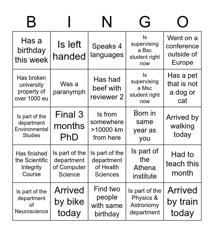 This bingo card has a free space and 32 words: Is part of the Physics & Astronomy department, Is part of the department of Chemistry & Pharmaceutical Sciences, Final 3 months PhD, First 3 months PhD, Has finished the Scientific Integrity Course, Was a paranymph, Went on a conference outside of Europe, Had to teach this month, Is left handed, Does an unique/wierd sport, Has had beef with reviewer 2, Speaks 4 languages, Is a middle child, Born in same month as you, Born in same year as you, Is part of the department of Mathematics, Is part of the department of Neuroscience, Is part of the department Environmental Studies, Is part of the department of Health Sciences, Is part of the department of Computer Science, Is part of the Athena institute, Got lunch at the caffeteria today, Arrived by walking today, Arrived by bike today, Arrived by train today, Is supervising a Bsc student right now, Is supervising a Msc student right now, Has broken university property of over 1000 eu, Has a birthday this week, Find two people with same birthday, Has 4+ siblings and Has a pet that is not a dog or cat.