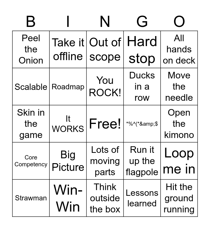 This bingo card has a free space and 71 words: Low hanging fruit, Take it offline, Pick your brain, Deep Dive, Think outside the box, Out of pocket, Hard stop, My Wheelhouse, Ducks in a row, Drinking the Kool-Aid, Strawman, Circle back, Move the needle, Peel the Onion, Cast a wide net, Skin in the game, Run it up the flagpole, All hands on deck, Drill down, Open the kimono, Big Picture, Hit the ground running, Loop me in, Game changer, Unicorn, Trusted Partners, Cut and dry, Sorry I was on Mute, Window of Opportunity, Body of work, Win-Win, Reach out, Agility, Boil the ocean, Lessons learned, It is what it is, Over the wall, Best practice, Scalable, Burning platform, Lots of moving parts, Empower, Core Competency, Swim Lane, This really has legs, Giving 110%, Fast Track, Roadmap, The screen is too BIG, Why does MiCSES look different, My link to MiCSES doesn’t work, What’s an LGAD, *%^(*&$, Trying to use LGAD for LMS, What is MFA, Tears (yours or theirs), You ROCK!, MiLogin (or general public call), You should have told us in advance, Sticky Data, You LIED, The fixed bug, not fixed, It WORKS, I want old MiCSES back, Light or Dark mode ‘stuck’, You said this was fixed, Out of scope, Working as designed, It’s a function not a bug, That shouldn’t be happening and Dropped an action item.