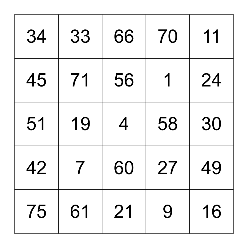This bingo card has 25 words: 7, 21, 56, 75, 11, 34, 45, 33, 58, 60, 1, 51, 27, 49, 71, 16, 30, 66, 24, 19, 4, 61, 42, 70 and 9.