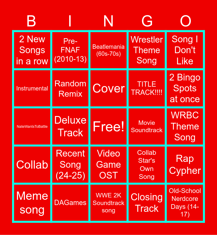 This bingo card has a free space and 37 words: Repeat Artist, Repeat Album, Repeat Song, Random Remix, Rap Cypher, Recent Song (24-25), Cover, New Artist, Song I Don't Like, Familiar Artist, New Song, Deluxe Track, Wrestler Theme Song, Old-School Nerdcore Days (14-17), WRBC Theme Song, Instrumental, Collab, Playlist Album Track, Beatlemania (60s-70s), Video Game OST, Movie Soundtrack, 2 New Songs in a row, 2 Bingo Spots at once, Meme song, WWE 2K Soundtrack song, Opening Track, Closing Track, Pre-FNAF (2010-13), As old as me (2005), Old School (80s-90s), BATIM, FNAF, DAGames, NateWantsToBattle, AJR, Collab Star's Own Song, TITLE TRACK!!!! and 5 Times Spots.