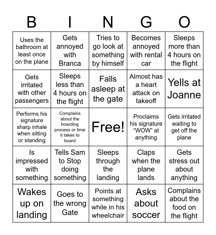 This bingo card has a free space and 24 words: Tells Sam to Stop doing something, Goes to the wrong Gate, Falls asleep at the gate, Wakes up on landing, Sleeps more than 4 hours on the flight, Uses the bathroom at least once on the plane, Gets irritated with other passengers, Gets annoyed with Branca, Proclaims his signature “WOW” at anything, Sleeps through the landing, Almost has a heart attack on takeoff, Performs his signature sharp inhale when sitting or standing, Claps when the plane lands, Gets stress out about anything, Sleeps less than 4 hours on the flight, Asks about soccer, Gets irritated waiting to get off the plane, Tries to go look at something by himself, Yells at Joanne, Complains about the boarding process or time it takes to board, Complains about the food on the flight, Is impressed with something, Becomes annoyed with rental car and Points at something while in his wheelchair.