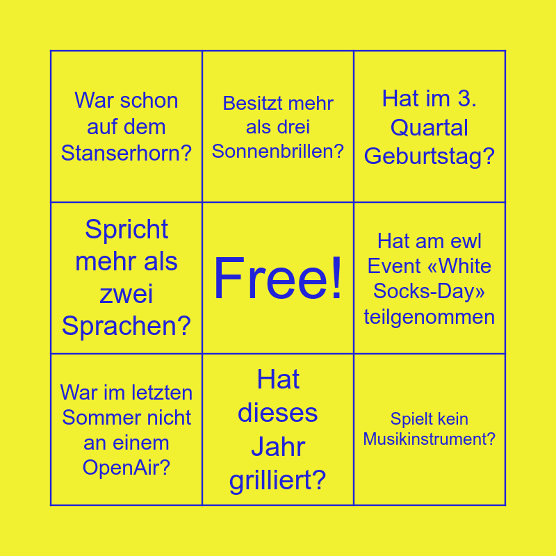 This bingo card has a free space and 16 words: Hat letztes Jahr in der Schweiz Urlaub gemacht?, War dieses Jahr im See schwimmen?, Hat im 3. Quartal Geburtstag?, War schon auf dem Stanserhorn?, Hat in diesem Jahr (noch) kein Buch gelesen?, Besitzt mehr als drei Sonnenbrillen?, Hat diese Jahr schon ein Eis gegessen?, Hat schon einmal einen Marathon oder Halbmarathon absolviert?, Spielt kein Musikinstrument?, Hat am ewl Event «White Socks-Day» teilgenommen, Arbeitet seit weniger als 5 Jahren bei ewl?, Spricht mehr als zwei Sprachen?, Hat in diesem Jahr schon Wassermelone gegessen?, Hat dieses Jahr grilliert?, War im letzten Sommer nicht an einem OpenAir? and Hat schon einen mehrmonatigen Sprachaufenthalt gemacht?.