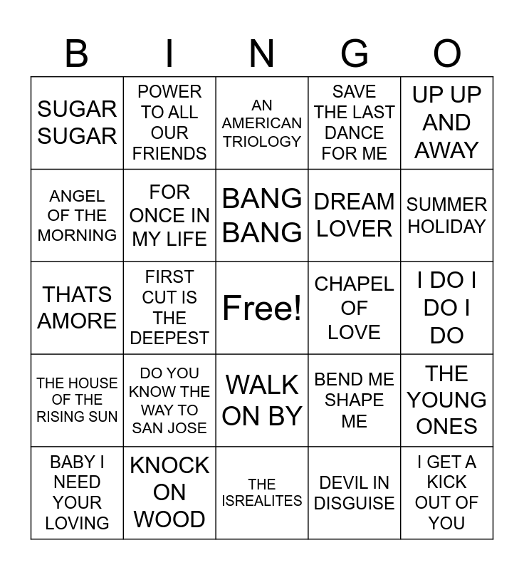 This bingo card has a free space and 44 words: A WORLD WITHOUT LOVE, I GET A KICK OUT OF YOU, HE AINT HEAVY HES MY BROTHER, BABY I NEED YOUR LOVING, TEQUILA, DEVIL IN DISGUISE, AN AMERICAN TRIOLOGY, BURNING LOVE, UP UP AND AWAY, KNOCK ON WOOD, SAVE THE LAST DANCE FOR ME, CHAPEL OF LOVE, WALK ON BY, DO YOU KNOW THE WAY TO SAN JOSE, THE WANDERER, THE ISREALITES, RUNAWAY, THATS AMORE, BAD MOON RISING, SUMMER HOLIDAY, POWER TO ALL OUR FRIENDS, LIVING DOLL, DO YOU WANNA DANCE, SUGAR SUGAR, BACHOLAR BOY, I DO I DO I DO, SAY ALITTLE PRAYER, THE NIGHT HAS A THOUSAND EYES, BEND ME SHAPE ME, THE HOUSE OF THE RISING SUN, MONDAY MONDAY, THE YOUNG ONES, MY BOY LOLLYPOP, 3 STEPS TO HEAVEN, FIRST CUT IS THE DEEPEST, MY GIRL, LOVE IS ALL AROUND, THE HIPPY HIPPY SHAKE, BANG BANG, ANGEL OF THE MORNING, DREAM LOVER, EVERLASTING LOVE, FOR ONCE IN MY LIFE and TO LOVE SOMEBODY.
